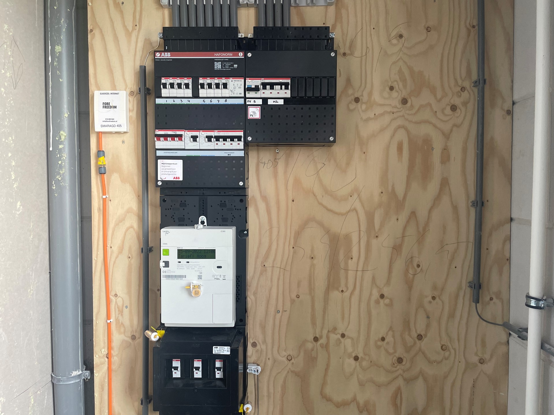 - Meterkast met 8 groepen, 2 aardlekschakelaars, krachtstroom en groepen voor zonnepanelen;