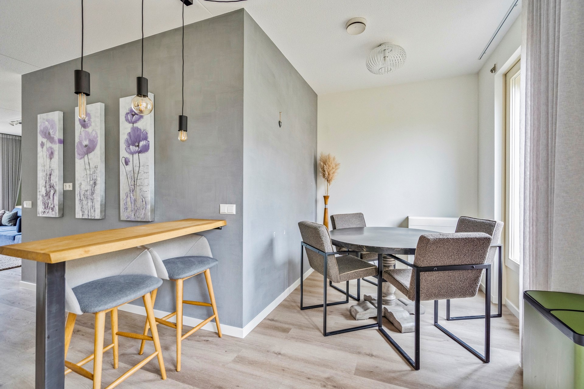 Luxe moderne open keuken in rechte opstelling met eetbar en 2 krukken en eetgedeelte met tafel en 4 stoelen, is gelegen aan de voorzijde van de woning, voorzien van de volgende inbouwapparatuur; een 5-pits inductieplaat, afzuigkap, oven, magnetron, koelkast, vriezer en een vaatwasser (2023). Tevens zal een Nespresso apparaat achterblijven. De openslaande deuren met Frans balkon zorgen voor veel lichtinval en een goede ventilatiemogelijkheid.