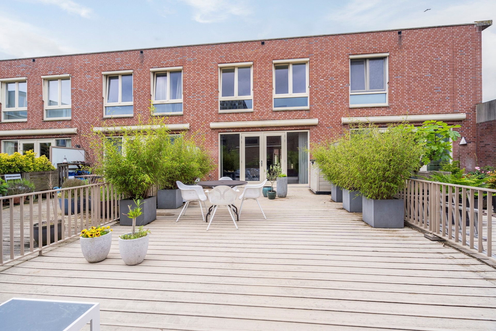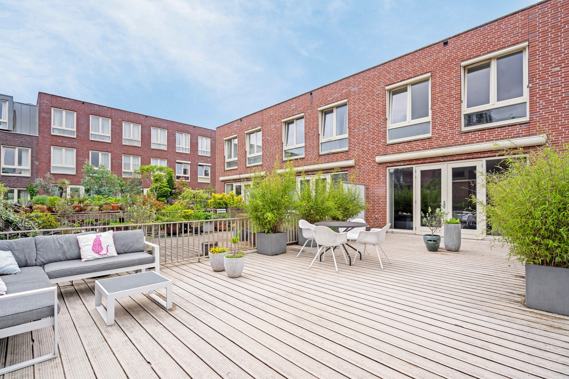 Aan de achterzijde is de woning voorzien van een daktuin boven de garage van maar liefst 54 m²! met vlonderterras en volledig ingericht met plantenbakken, lounge set, opberg box voor tuinkussens, tuintafel met stoelen en een waterkraan met slanghaspel. Het dakterras is bereikbaar vanuit de woonkamer en voorzien van een elektrisch zonnescherm.