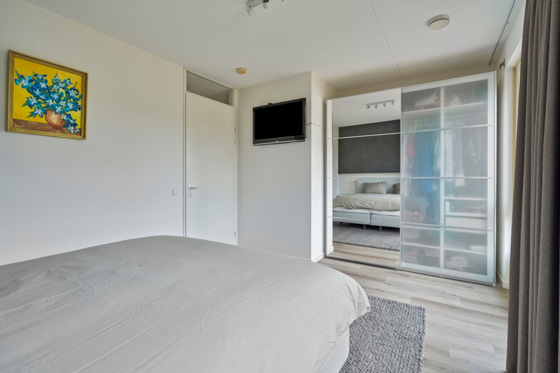 Slaapkamer 1 (16 m²), gelegen aan de voorzijde met vrij uitzicht en schuin op de Maashaven, tevens beschikt de slaapkamer over grote opengaande ramen een Auping tweepersoonsbed en grote kledingkast.