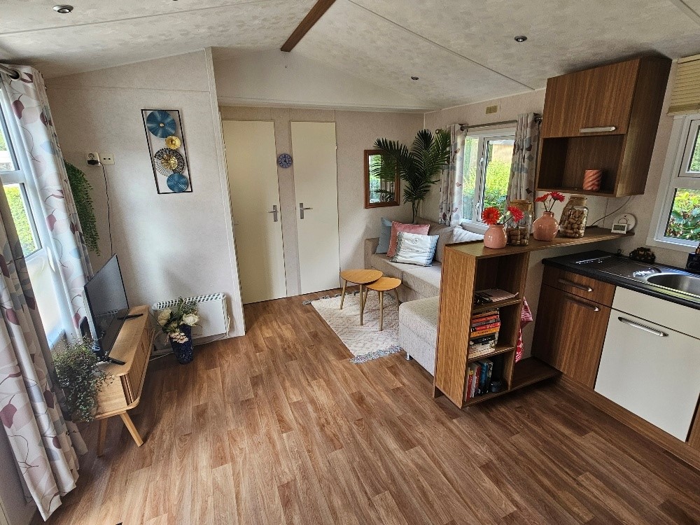 De living is voorzien van een keurig bankstel, elektrische verwarming, tuindeur en inbouwspots. De gehele stacaravan is voorzien van een vinyl vloerbedekking.