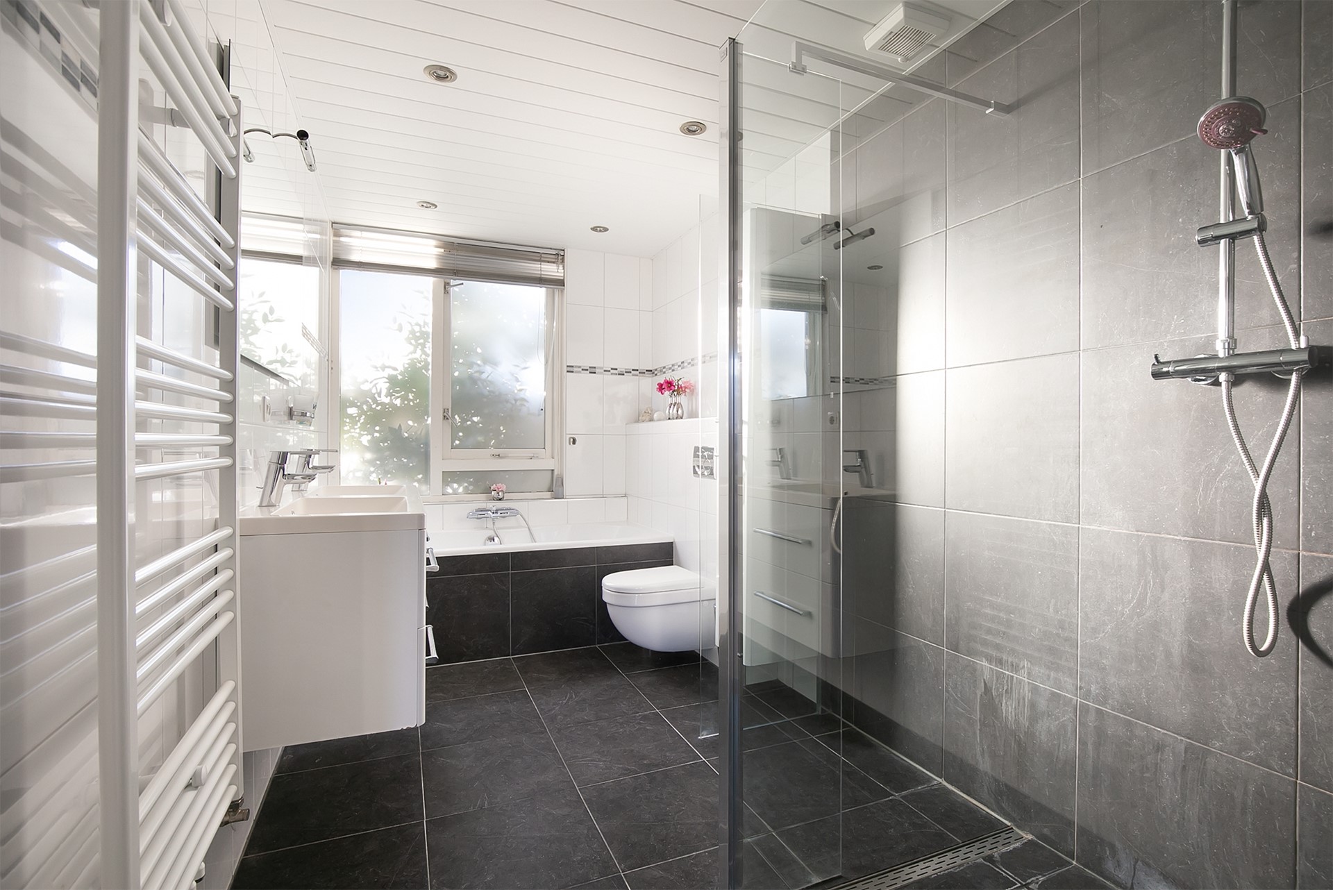 De royale badkamer is geheel betegeld en is voorzien van een duo ligbad, inloopdouche, dubbel badkamermeubel, wandcloset, designradiator en vloerverwarming.