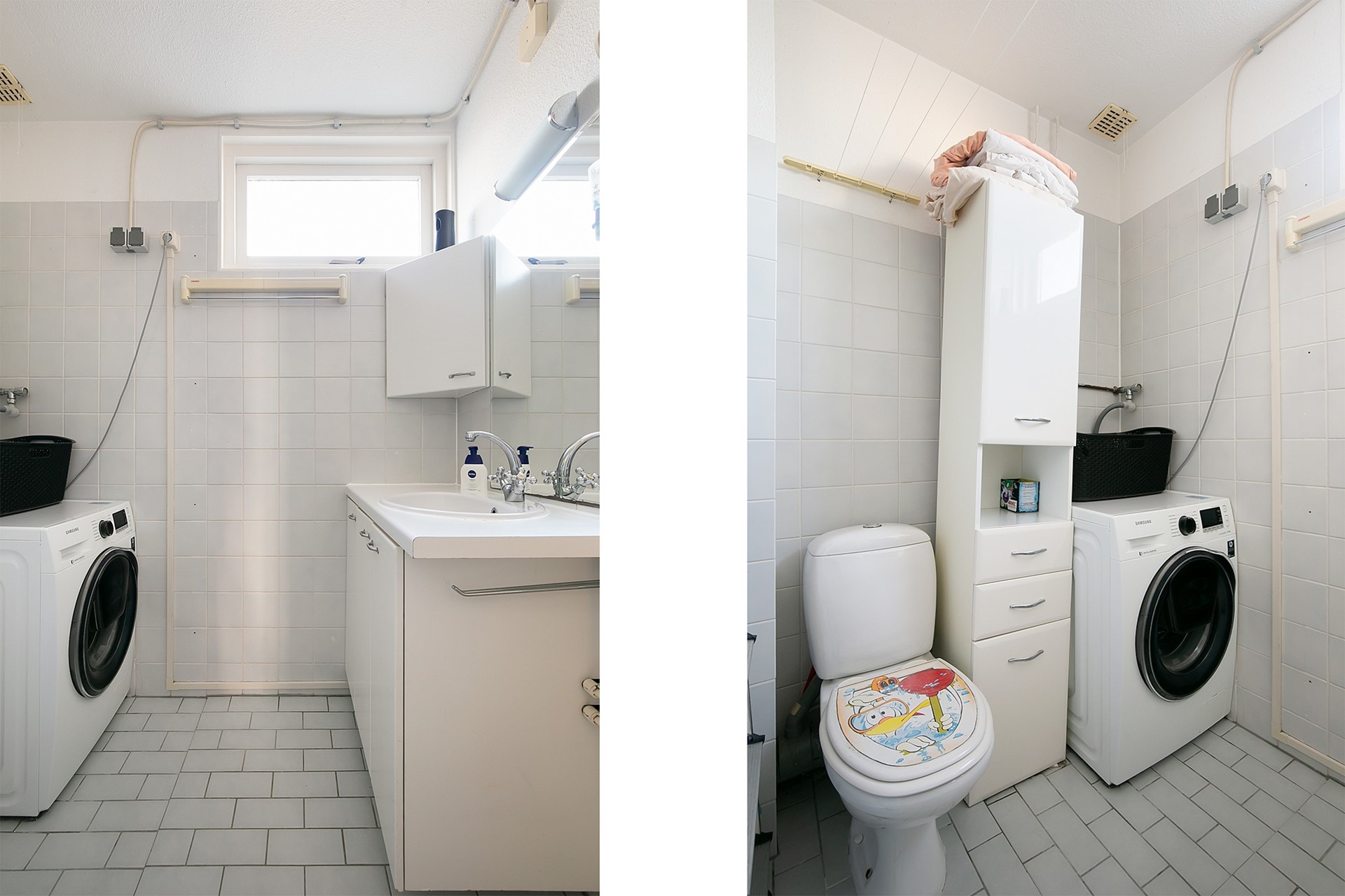 De praktische wasruimte is grotendeels betegeld en is voorzien van een toilet, badkamermeubel en een aansluiting voor de wasmachine.