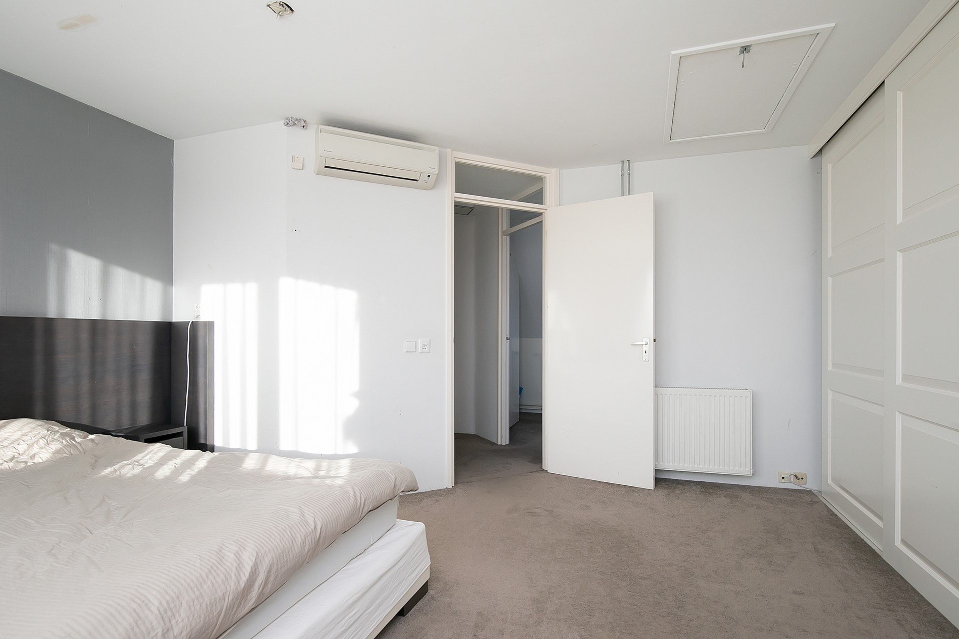 Slaapkamer 1 bevindt zich aan de achterzijde van de woning en is voorzien van glad gestuukte wanden.