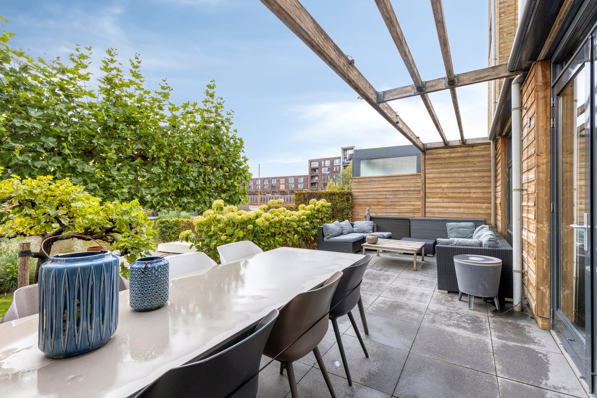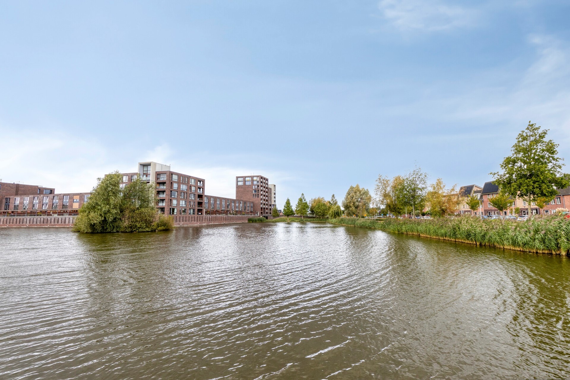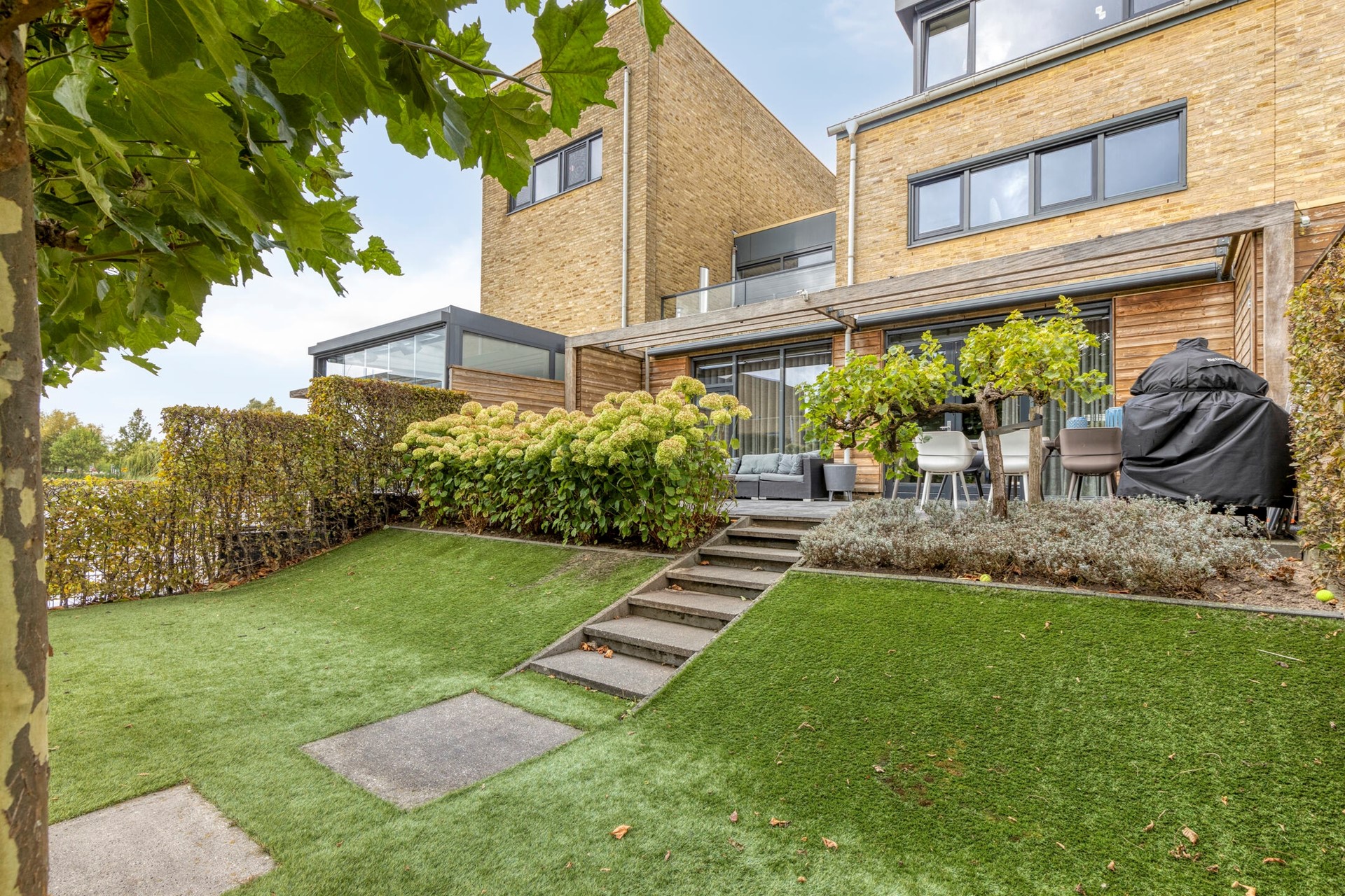 Hoogwaardig afgewerkte 2-onder-1-kapwoning aan de Volgerplas met vijf grote slaapkamers, kantoorruimte op de begane grond, prachtige tuin aan het water met eigen aanlegsteiger en twee parkeerplaatsen.