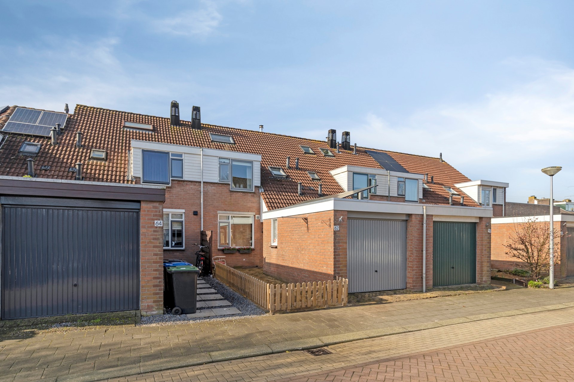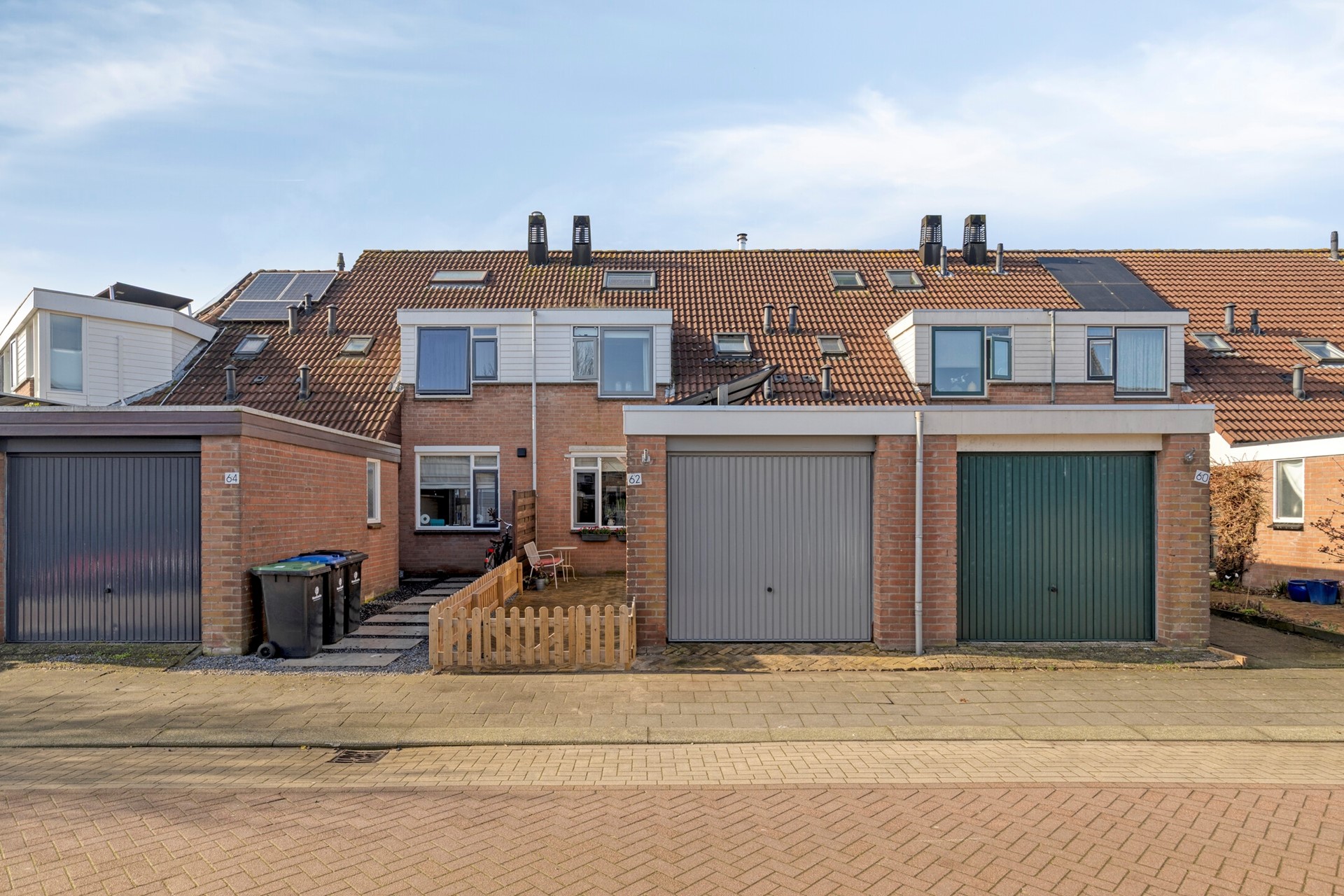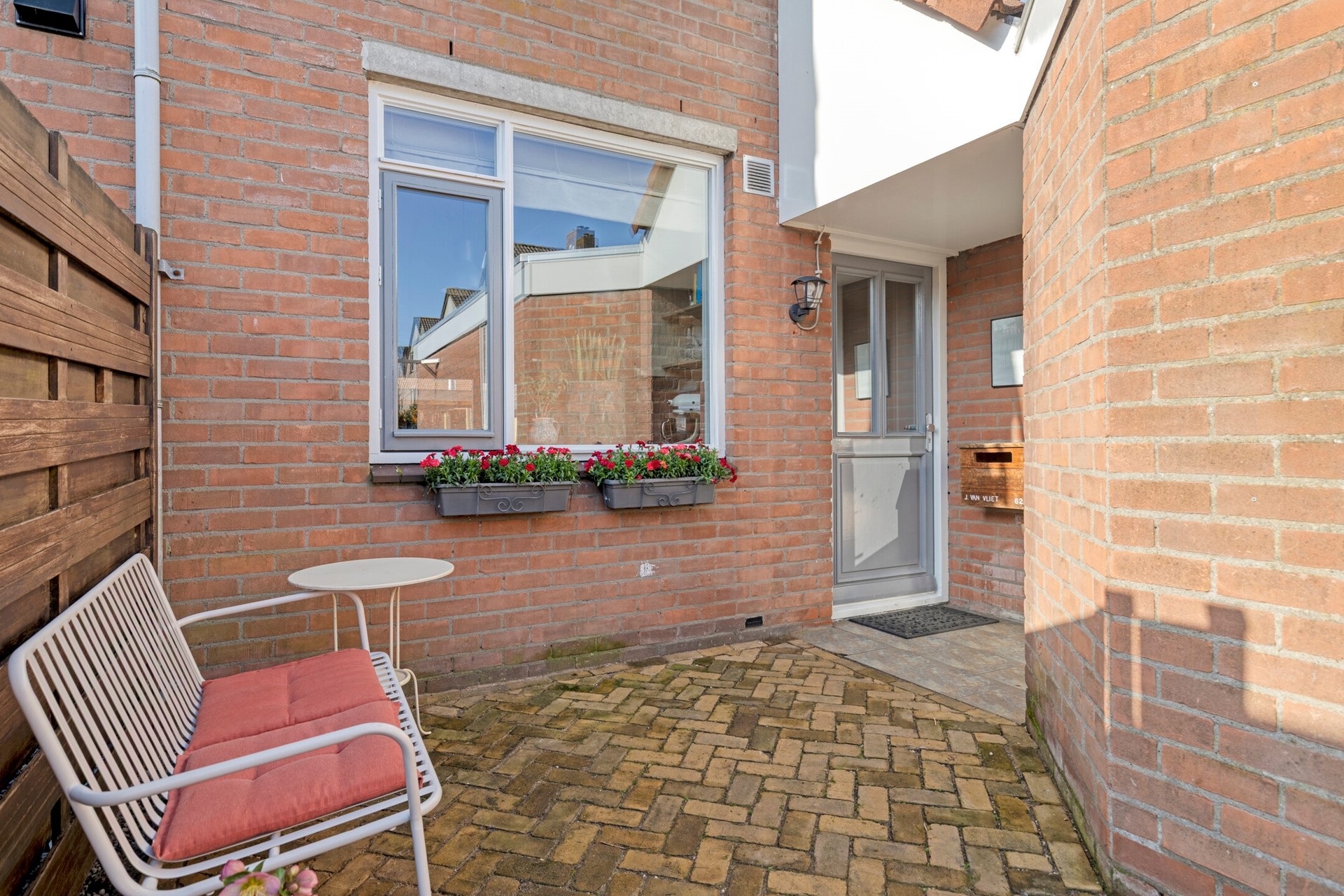 De voortuin is keurig aangelegd met straatwerk en hekwerk. Hier is het genieten in het ochtendzonnetje. Er is toegang tot de entree en de garage.