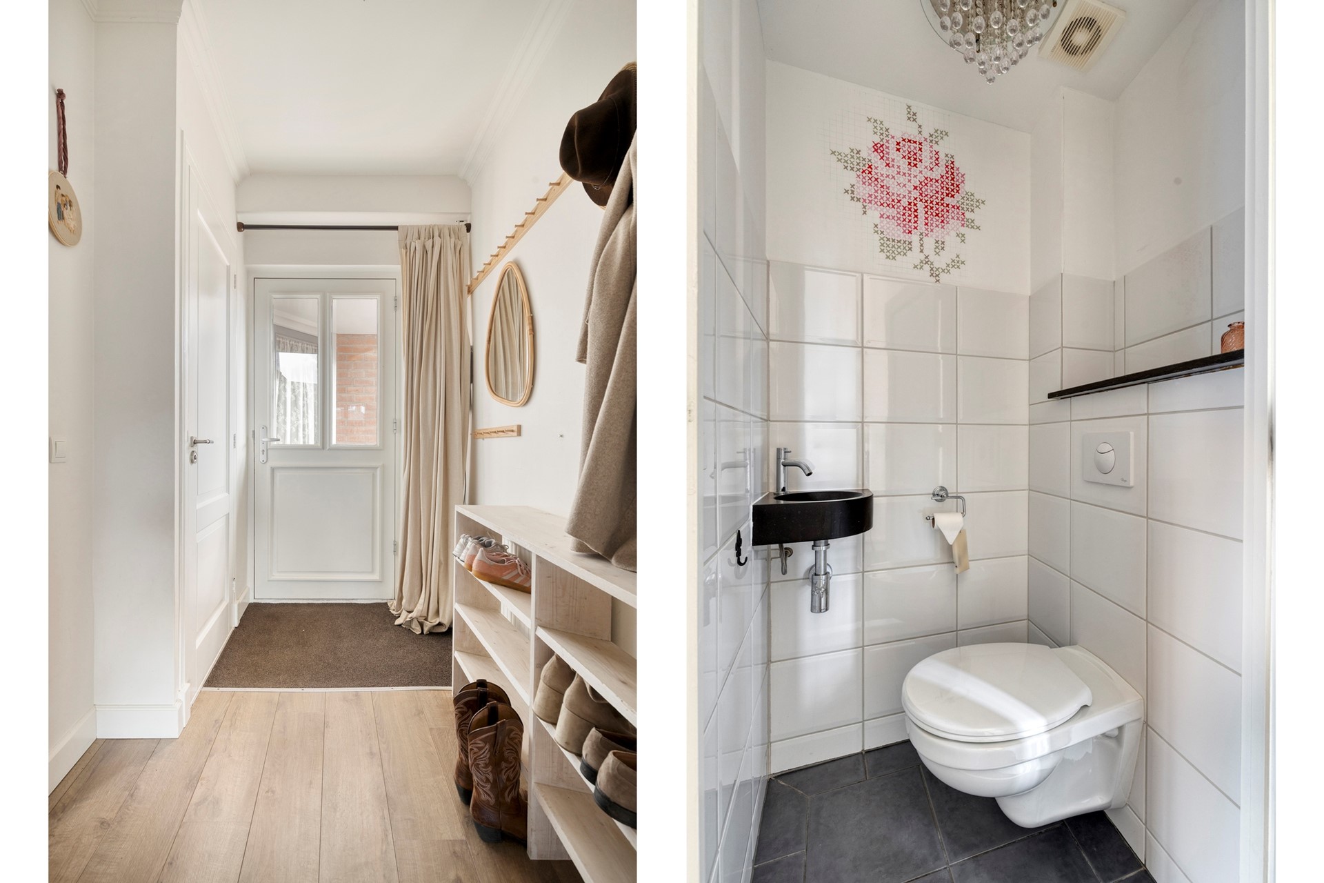 Het toilet is gedeeltelijk betegeld en is voorzien van een hangcloset en fontein.
