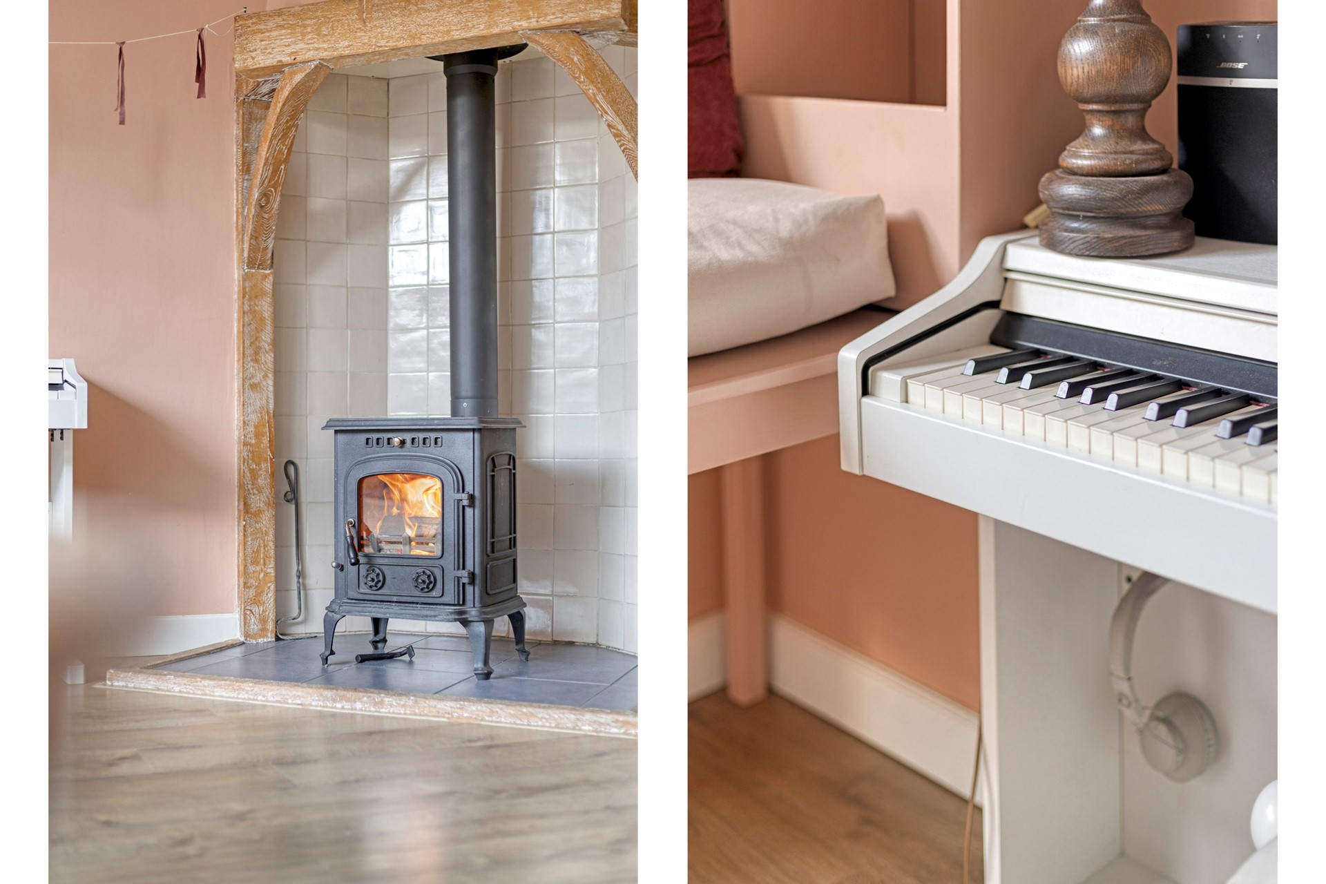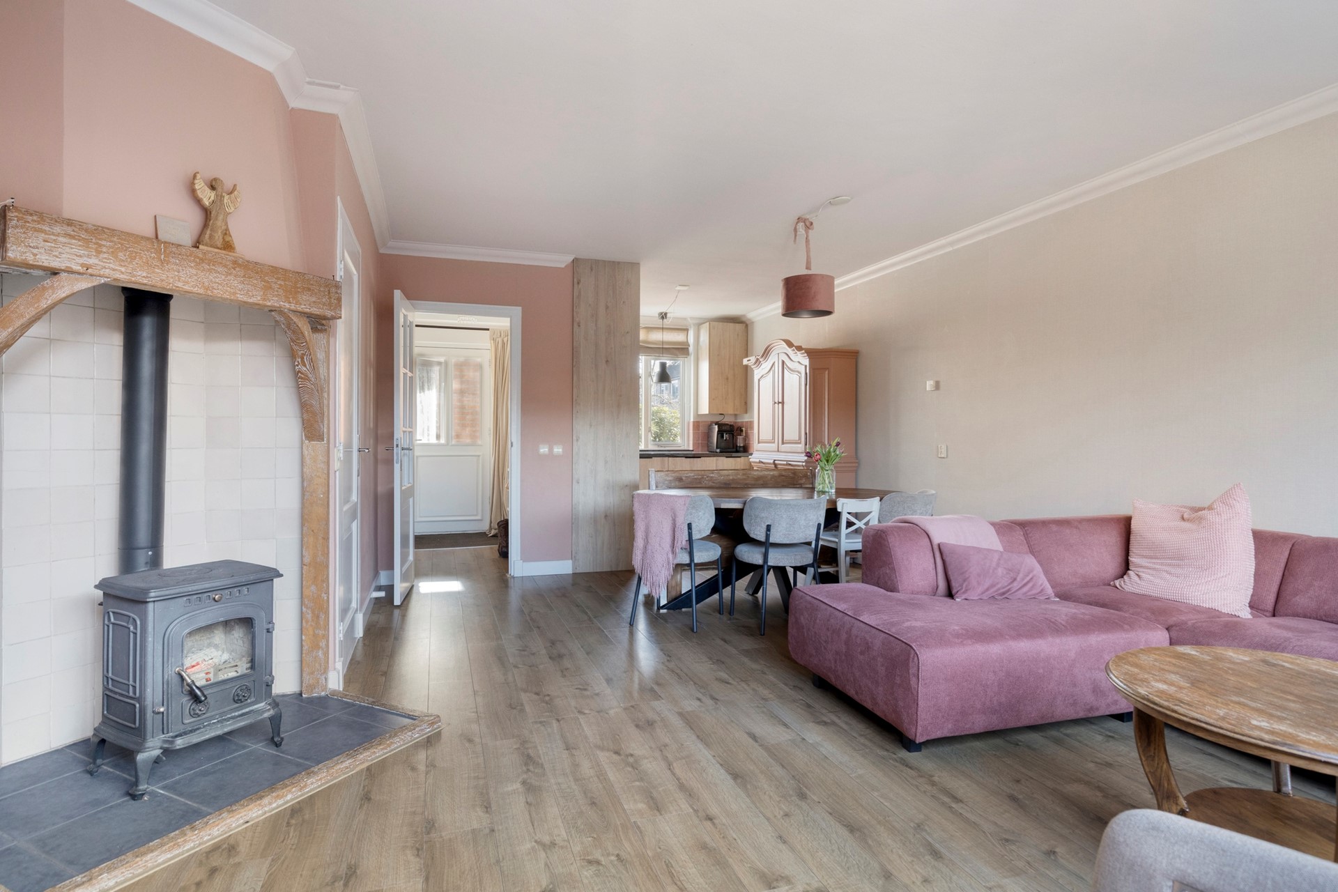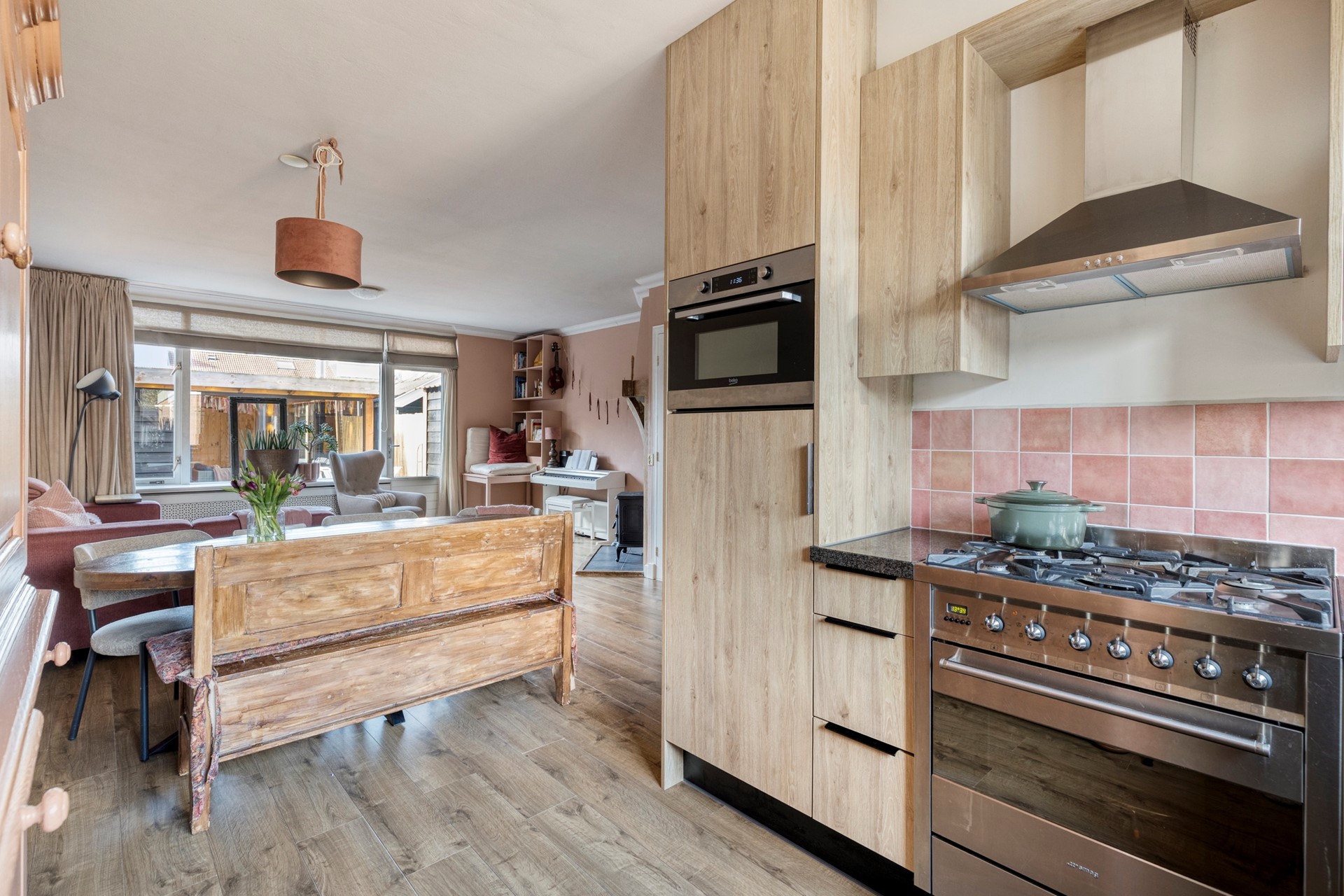 De ruime tuingerichte woonkamer met open keuken is echt een heerlijke ruimte! De kamer biedt plaats aan een sfeervolle schouw met houtkachel (vernieuwde dubbelwandige kachelpijp), handige trapkast en toegangsdeur naar de tuin.