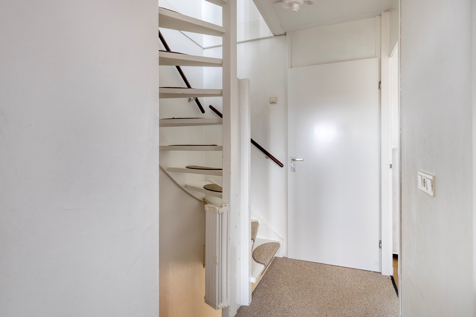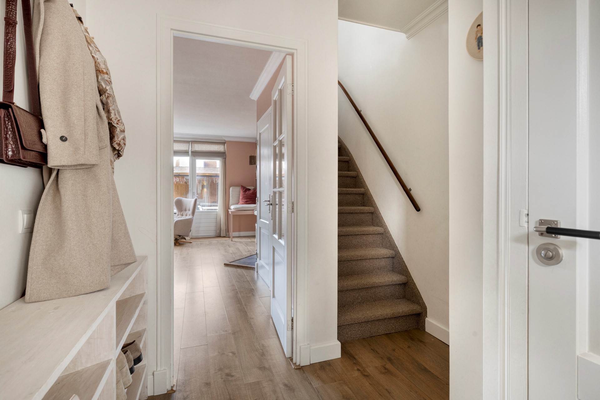 De entree biedt plaats aan de meterkast (6 groepen + aardlekschakelaar) en geeft toegang naar de woonkamer en het toilet. Middels een vaste trap is er toegang naar de 1e verdieping. De begane grond is keurig afgewerkt met laminaatvloeren en glad gestuukte wanden en plafonds.