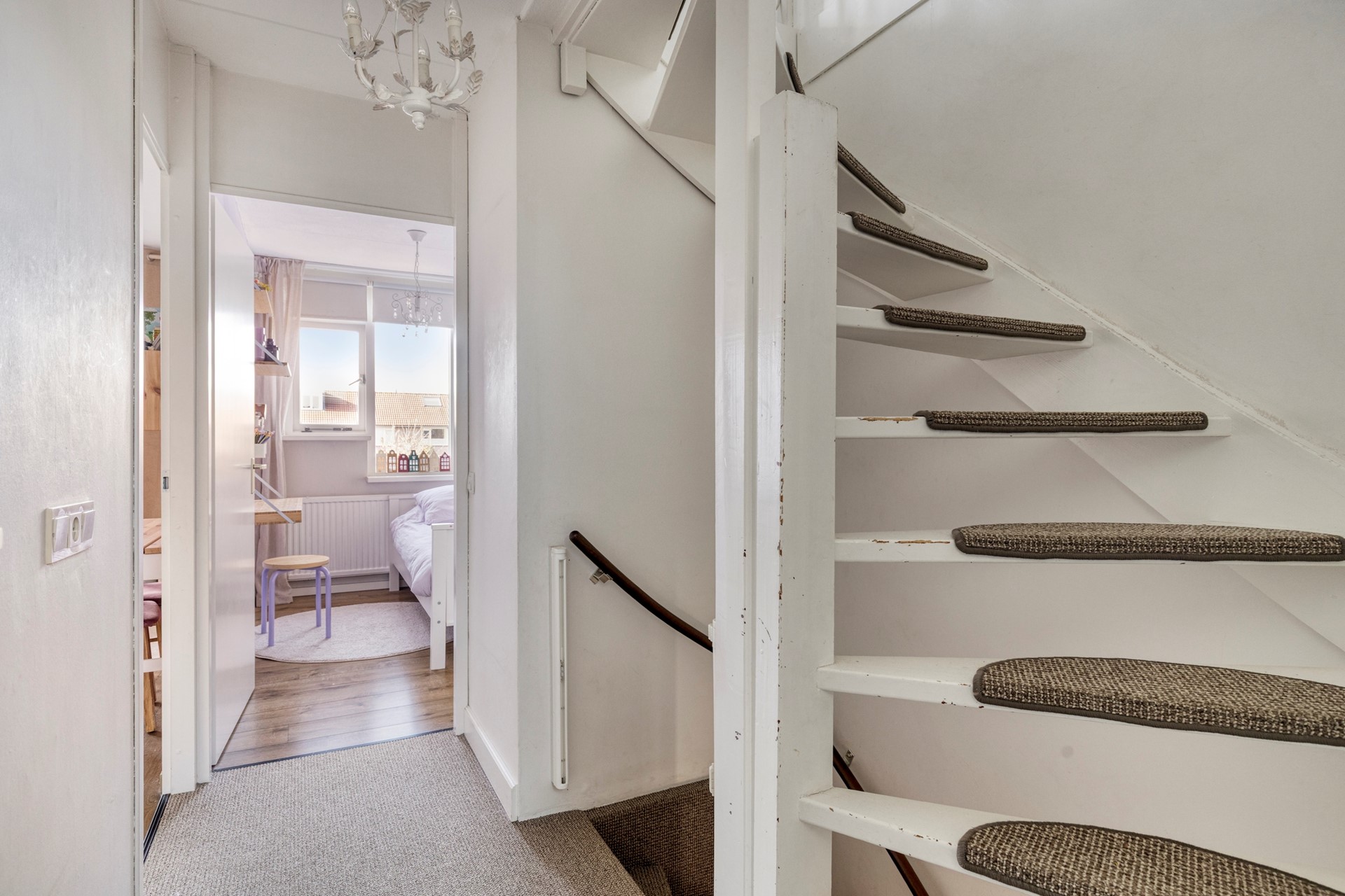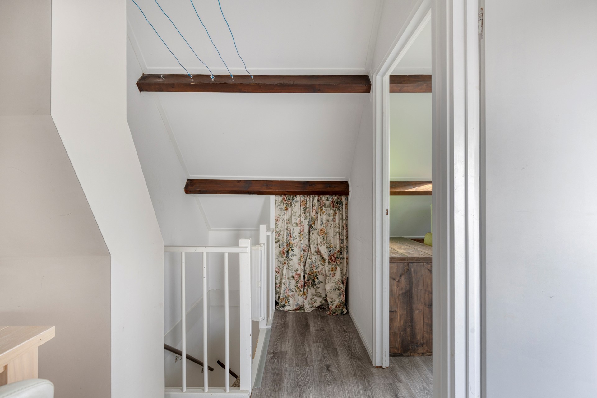 De overloop op de 1e verdieping biedt toegang tot 3 slaapkamers en de luxe badkamer en middels een vaste trap heeft u toegang tot de tweede verdieping.