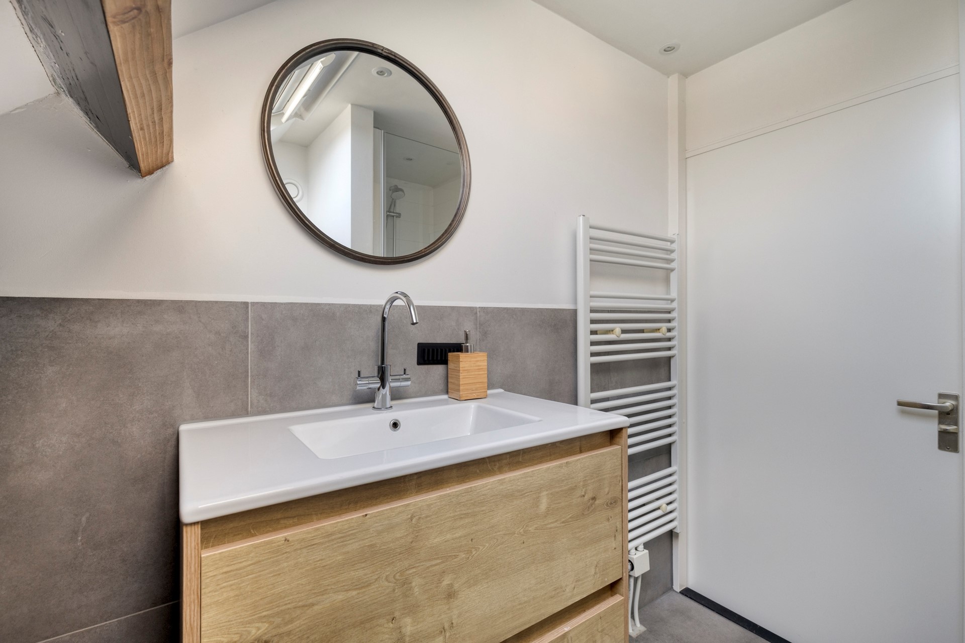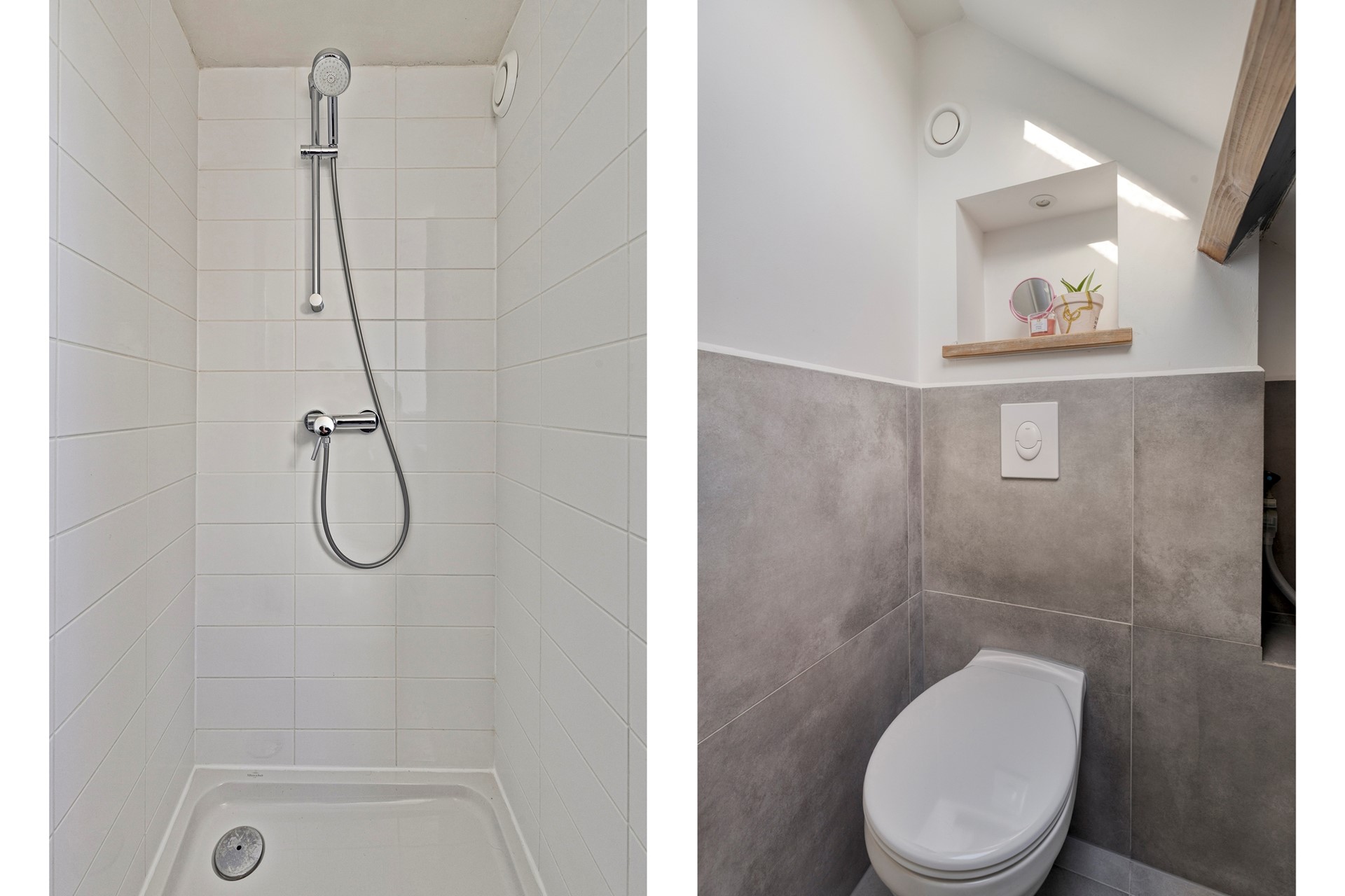 De moderne badkamer is gedeeltelijk betegeld en is voorzien van een douchecabine, 2e toilet, badkamermeubel en een designradiator. Tevens beschikt de badkamer over een kunststof dakraam en een aansluiting voor de wasmachine.