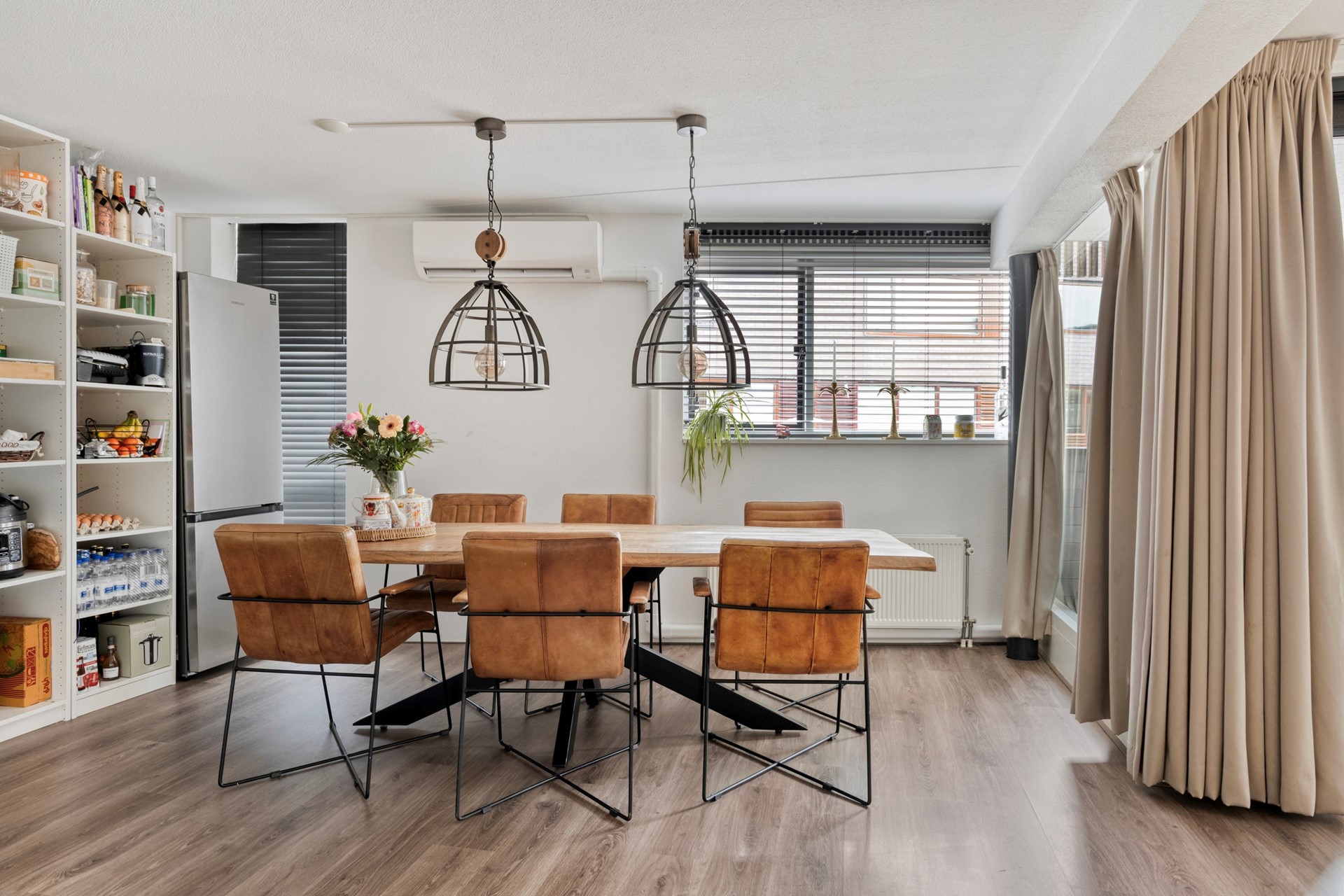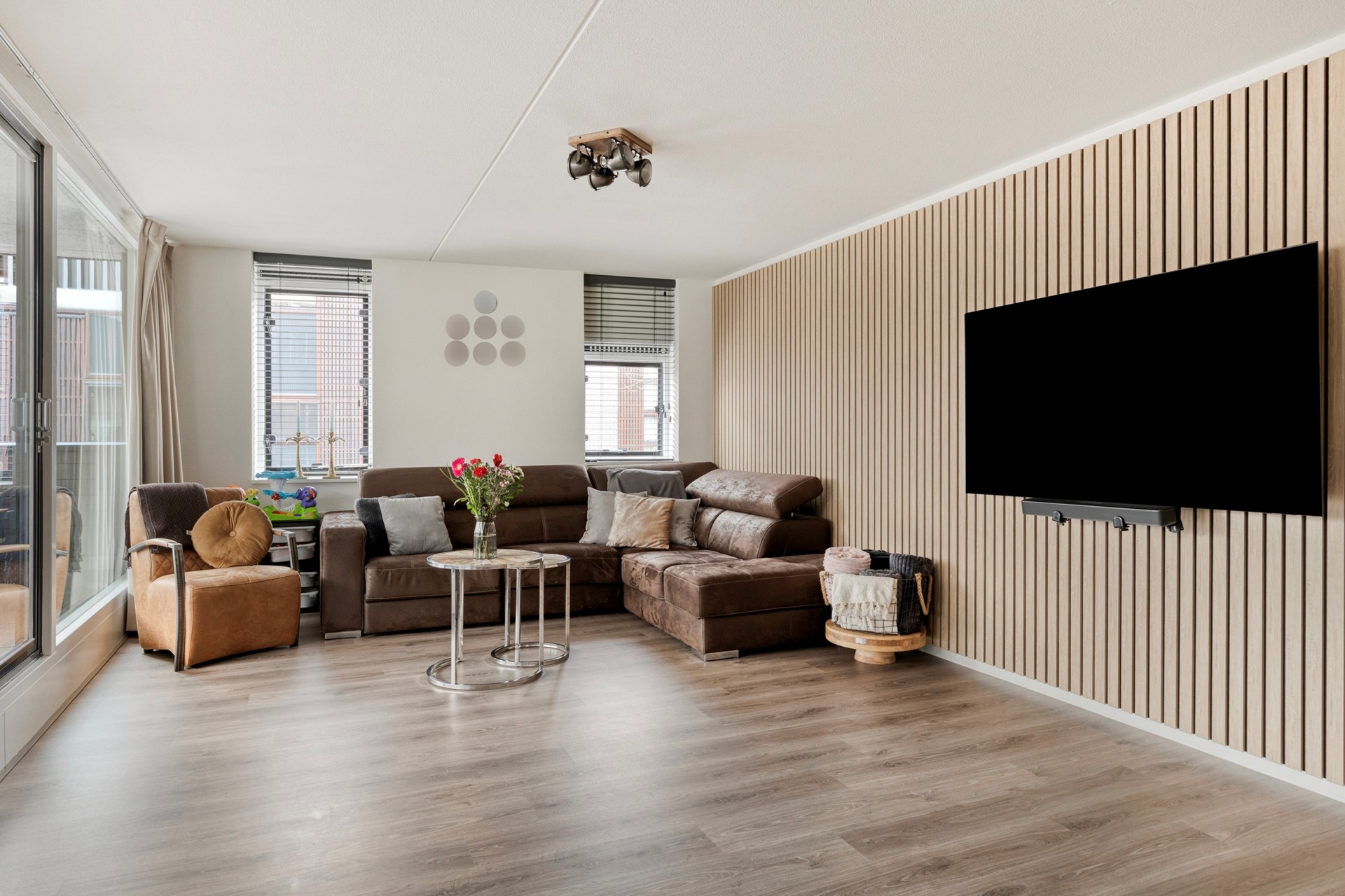 De riante woonkamer is voorzien van veel lichtinval door de grote ramen en biedt middels een schuifpui toegang naar het buitenterras. De woonkamer is voorzien airconditioning (2021) en de cinewall (2024) is een echte eyecatcher.