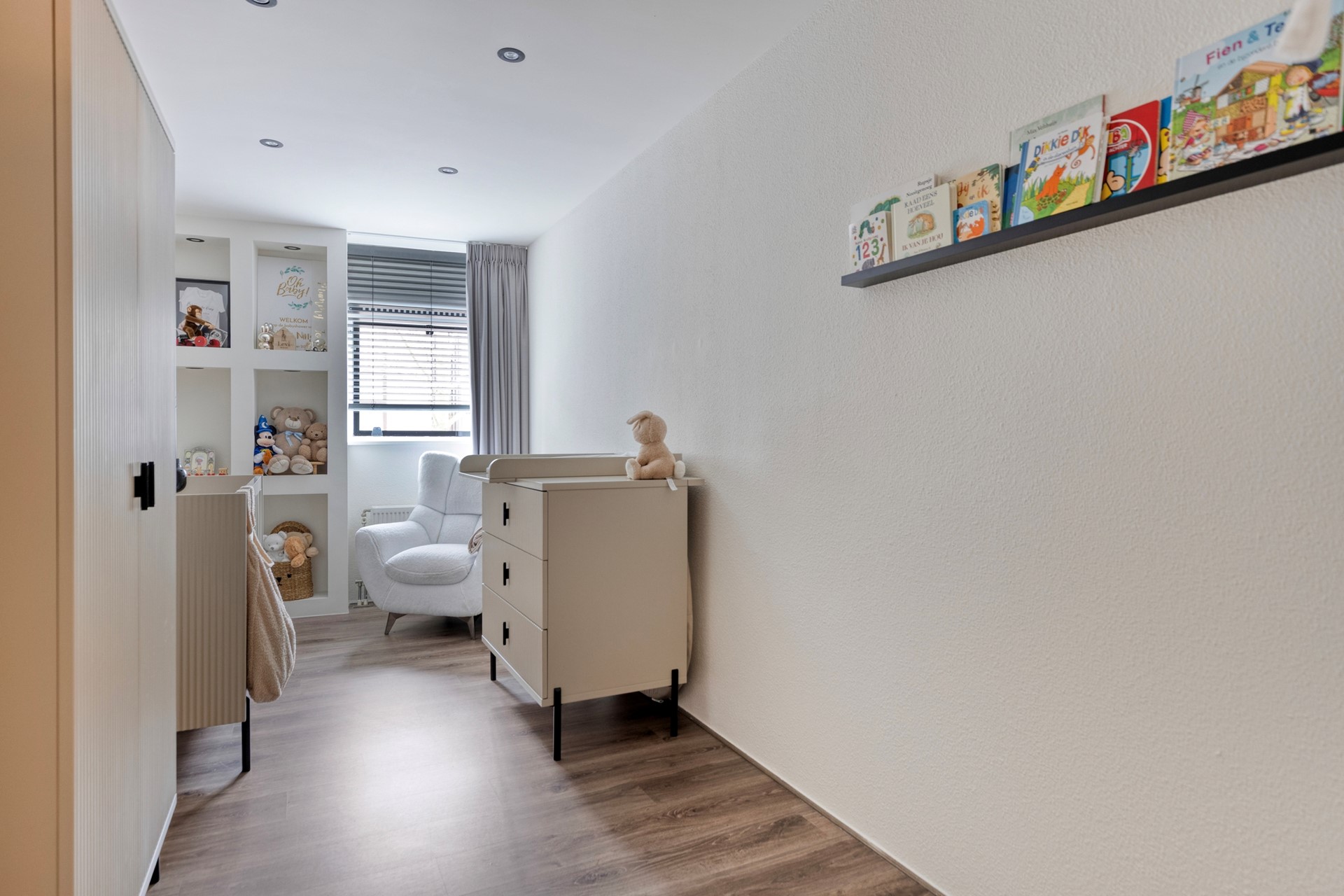 De ruime hal geeft toegang naar de verschillende vertrekken en biedt plaats aan een vaste kast met hierin de opstelplaats van de HR CV-combiketel (Intergas, 2021), mechanische ventilatiebox (2019), aansluiting wasmachine en droger en de meterkast (7 groepen + 3 aardlekschakelaars). Het gehele appartement is keurig afgewerkt met laminaatvloeren en strakke wand- en plafondafwerking.