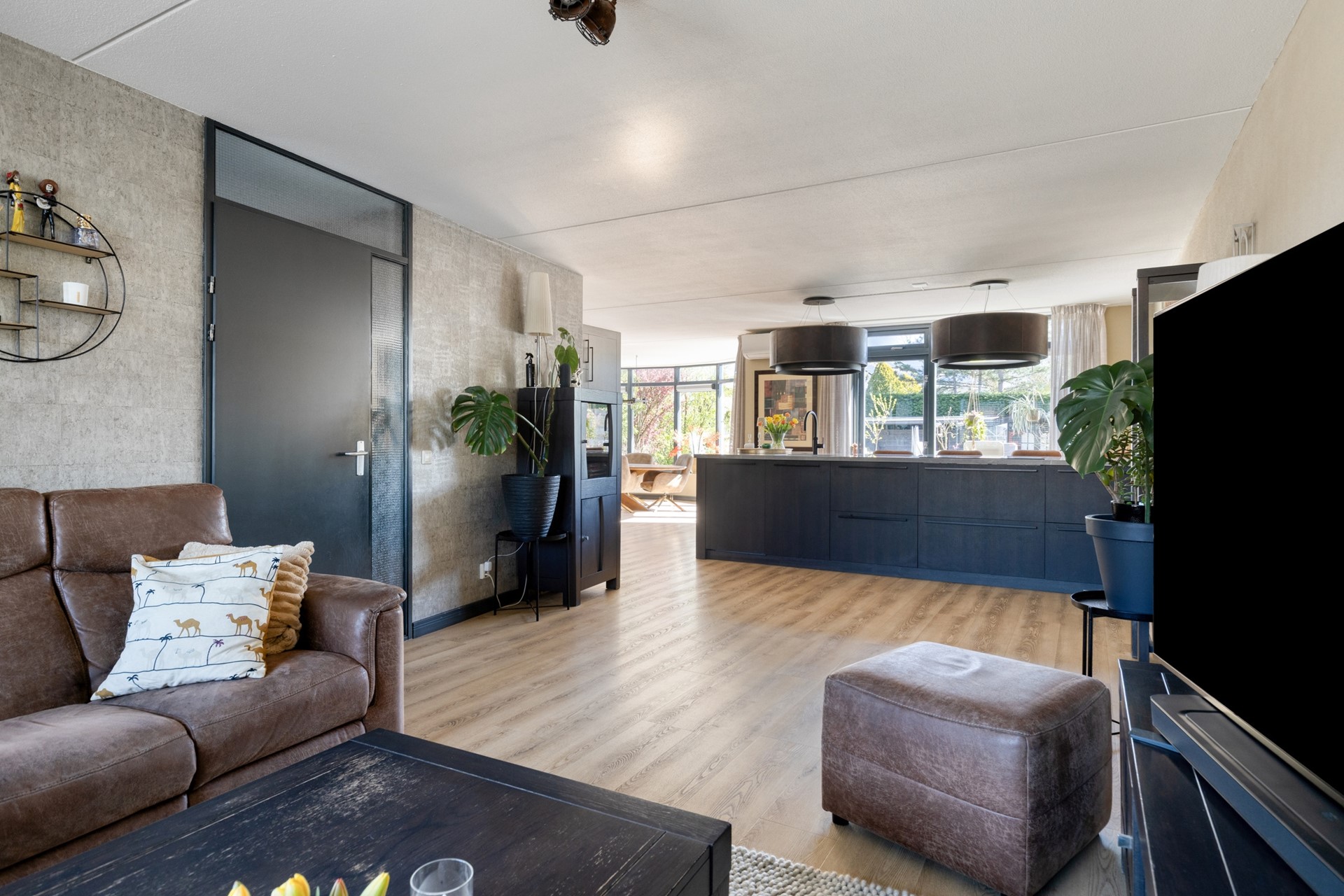 De woonkamer vormt het hart van de woning en straalt ruimte en comfort uit. Dankzij de doorzonopzet en de uitbouw aan de voorzijde beschikt deze leefruimte over een indrukwekkende oppervlakte van circa 59 m². De afwerking is hoogwaardig met een PVC vloer inclusief vloerverwarming en strak gestuukte wanden. Grote raampartijen zorgen voor een overvloed aan daglicht en bieden een fraai uitzicht op de tuin. Aan de voorzijde zijn elektrisch bedienbare houten lamellen van Somfy geplaatst, wat zowel sfeer als comfort toevoegt. De aanwezigheid van airconditioning, een ruime trapkast en de open verbinding met de eet- en keukenruimte maken dit een bijzonder aangename leefomgeving. De erker aan de voorzijde geeft extra karakter en ruimte aan het zitgedeelte.