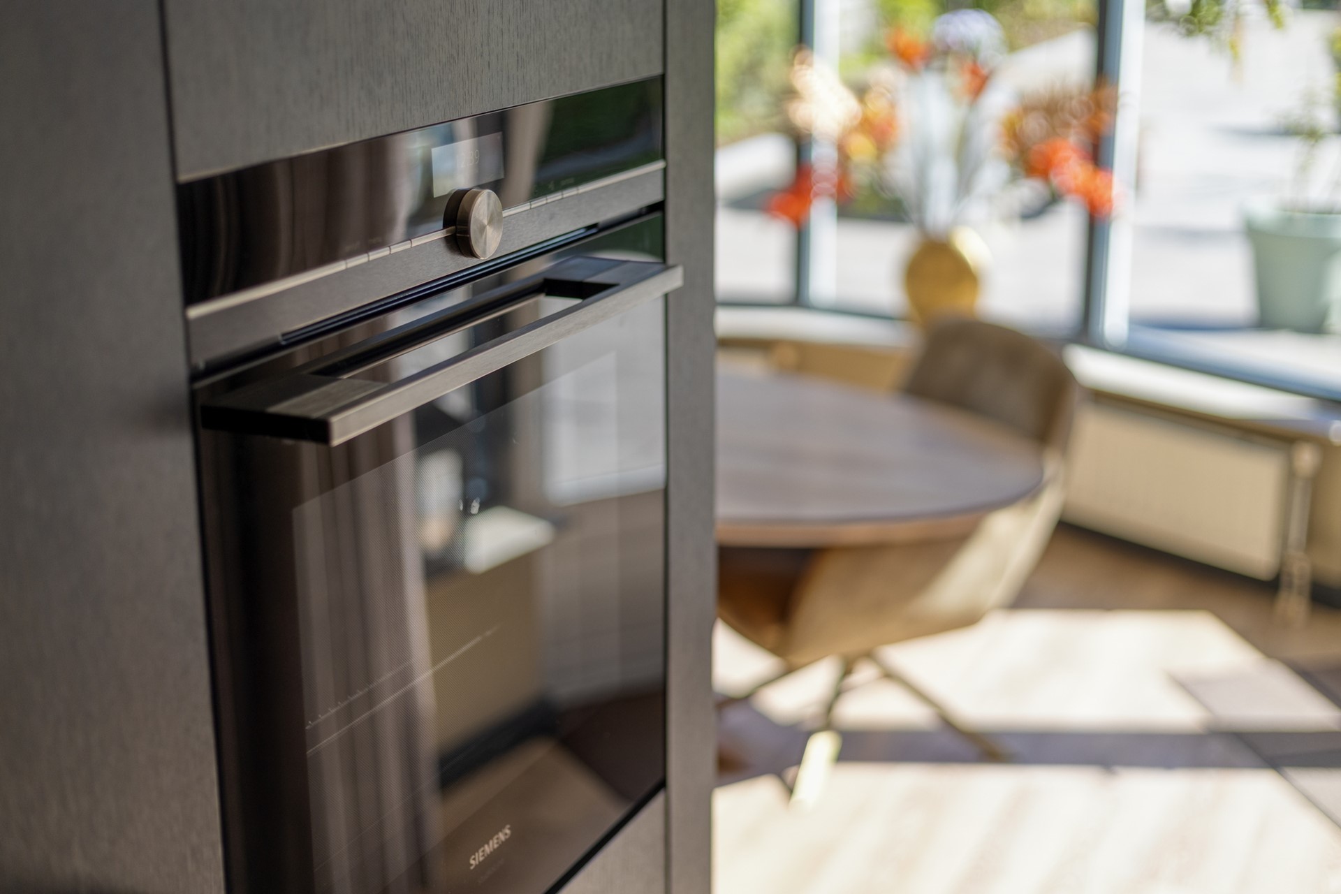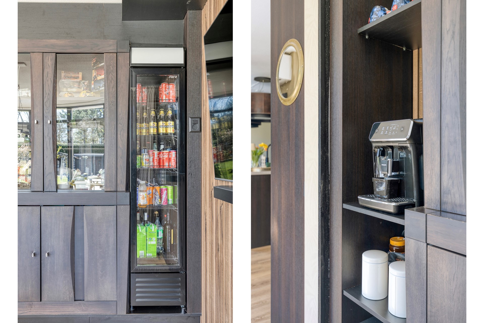 Aan de achterzijde van de woning bevindt zich het eetgedeelte, dat naadloos aansluit op de woonkamer en openkeuken. Hier is een grote kastenwand geplaatst (ter overname), compleet met een ingebouwde koelkast en een stijlvolle koffiecorner. Dankzij de openslaande deuren staat deze ruimte in directe verbinding met de achtertuin, waardoor binnen en buiten moeiteloos in elkaar overlopen.