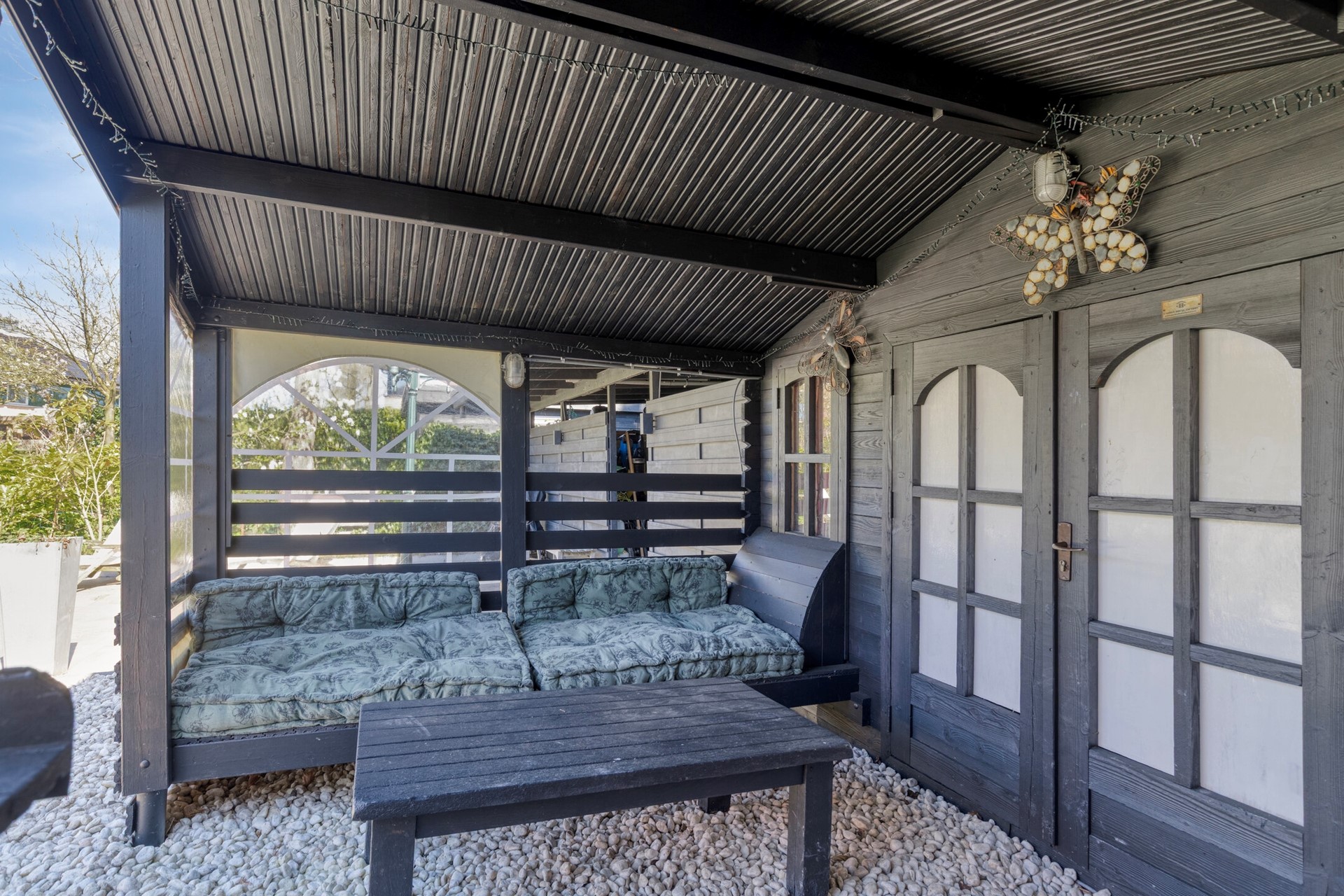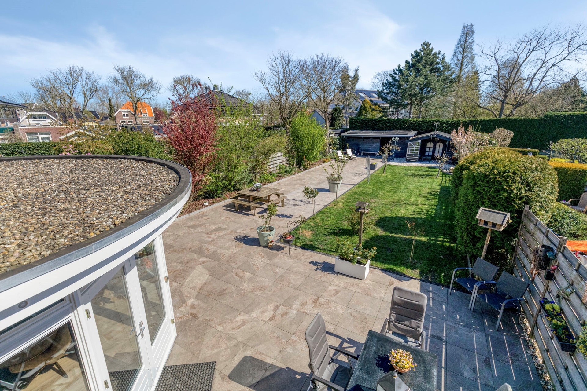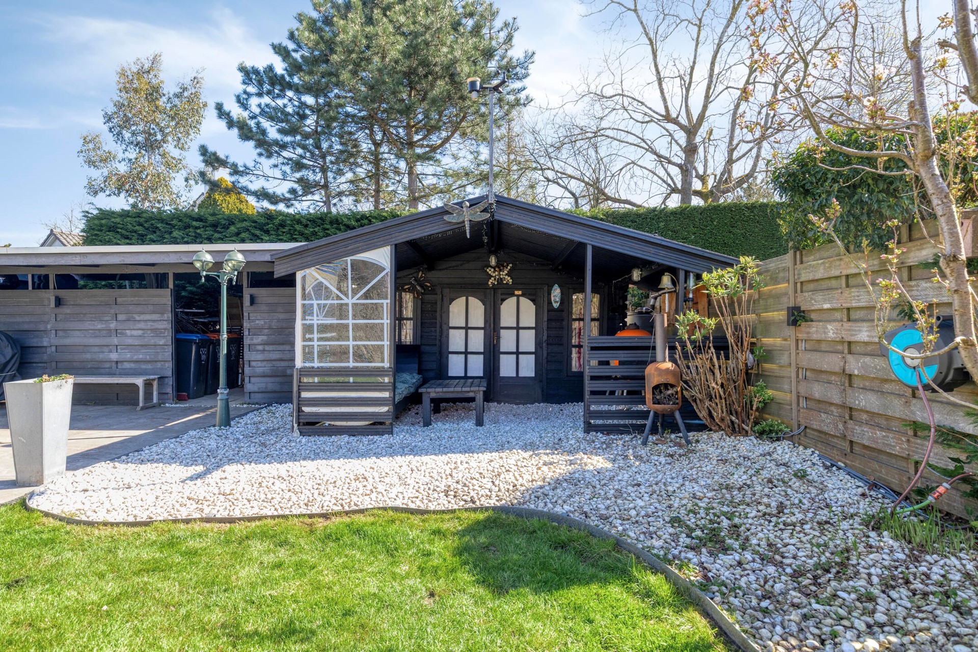 De achtertuin is indrukwekkend in zowel formaat als afwerking. Met een diepte van maar liefst 32 meter en een breedte van 11,75 meter biedt deze tuin volop ruimte en privacy. De ligging op het oosten, gecombineerd met de royale afmetingen, zorgt ervoor dat er op ieder moment van de dag een zonnige plek te vinden is. De tuin is fraai aangelegd met een combinatie van gras, meerdere terrassen en verzorgde plantenborders. Daarnaast zijn er diverse praktische en sfeervolle elementen toegevoegd, zoals een houten blokhut, een ruime fietsenberging en een gezellige overkapping. Het vrije uitzicht op het achterliggende groen maakt het geheel compleet. Verder is de tuin voorzien van meerdere wateraansluitingen met slanghaspels, een dompelpomp vanuit de sloot, een elektrisch bedienbaar zonnescherm en uitgebreide tuin- en buitenverlichting.
