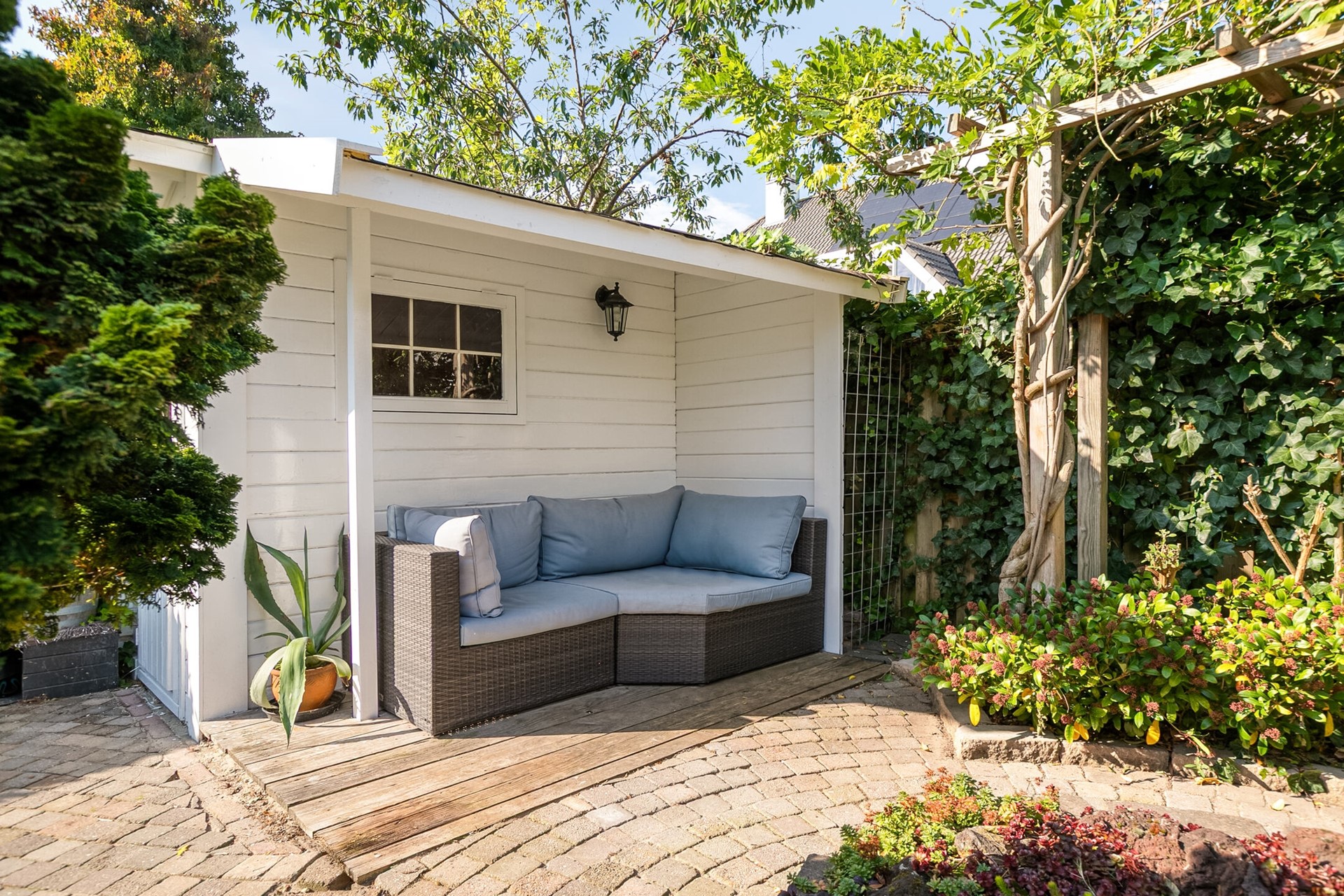 Hier wil je elke zomer doorbrengen! De fraai aangelegde achtertuin ca. 11 meter diep en 7,5 meter breed ligt op het westen, dus volop middag- en avondzon. Genieten onder de overkapping van de houten blokhut, met elektra, vaste planten, een wateraansluiting, sierbestrating én een zonnescherm. De tuin is omringd door houten schuttingen en een groene haag, met een poort naar de voorkant. Volop privacy en sfeer!